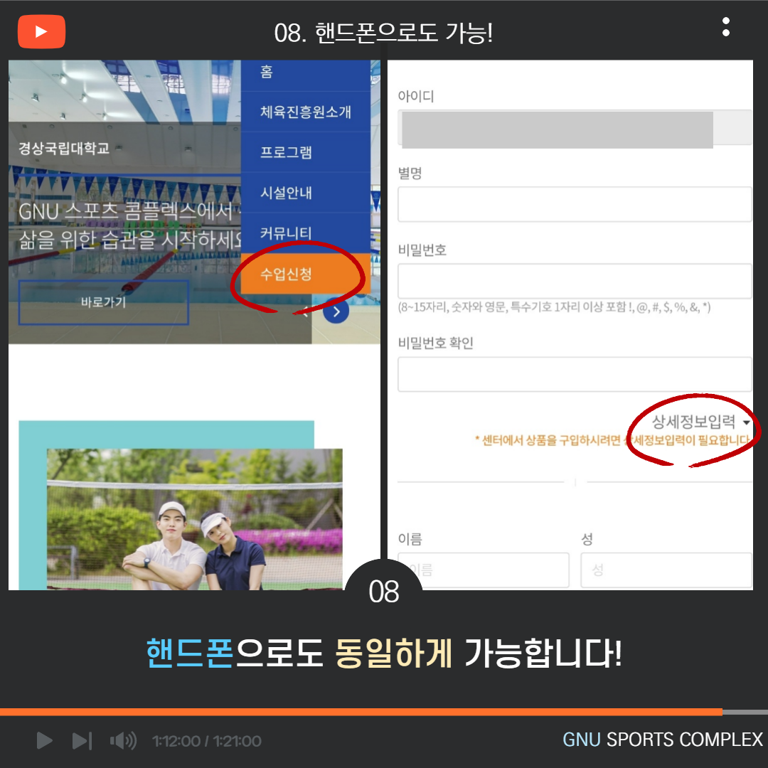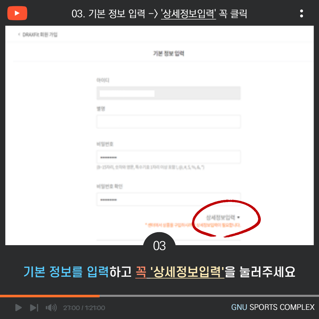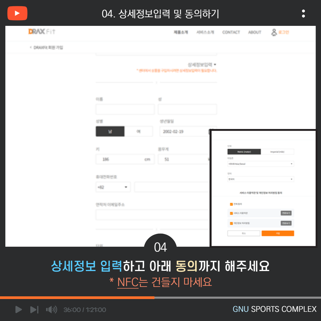 스포츠콤플렉스 온라인 회원 가입 안내 작성자관리자 작성일2021년 11월 02일 10시 17분 조회수4963 회원가입 상제정보 입력 중 체중은 30kg 이상 입력해주시고 NFC밴드는 '선택' 상태로 놔두셔야 회원가입이 진행 됩니다.