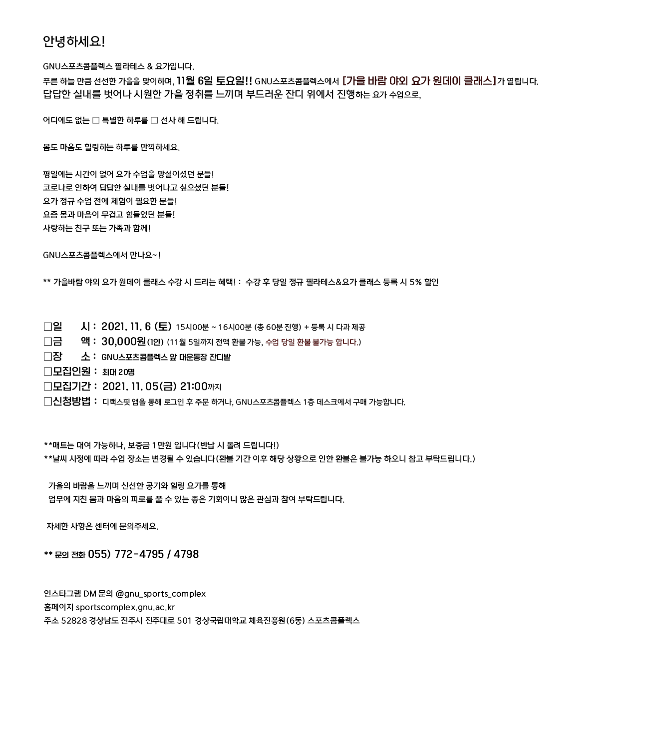11월 첫째주 "가을 바람 야외 요가 원데이 클래스" 안내