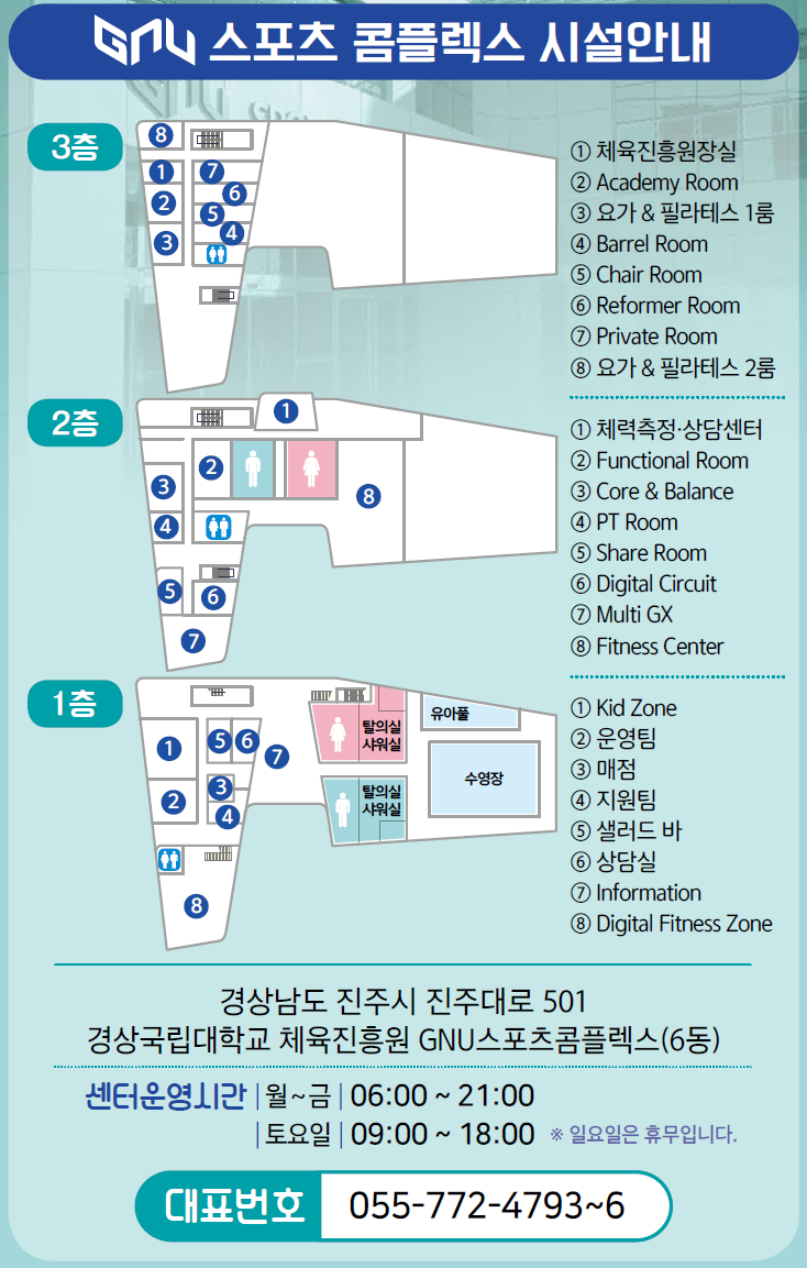 <운영시간> 월~금 : 06:00~21:00 / 토요일 : 09:00~18:00 / 일요일, 공휴일 휴관 / 자세한 공지 내용은 여기서 확인하세요.