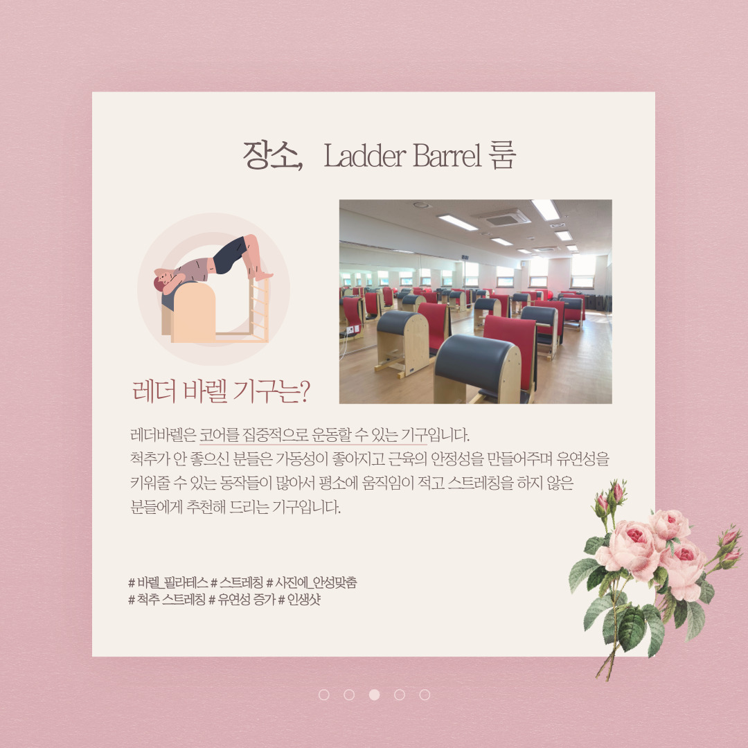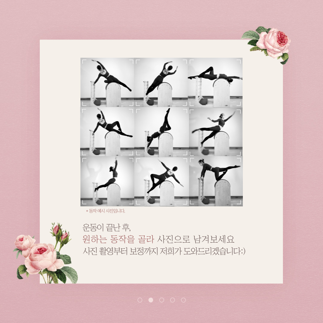 레더 바렐 필라테스 수업 진행 후 배운 동작을 이용하여 사진을 남기는 수업입니다